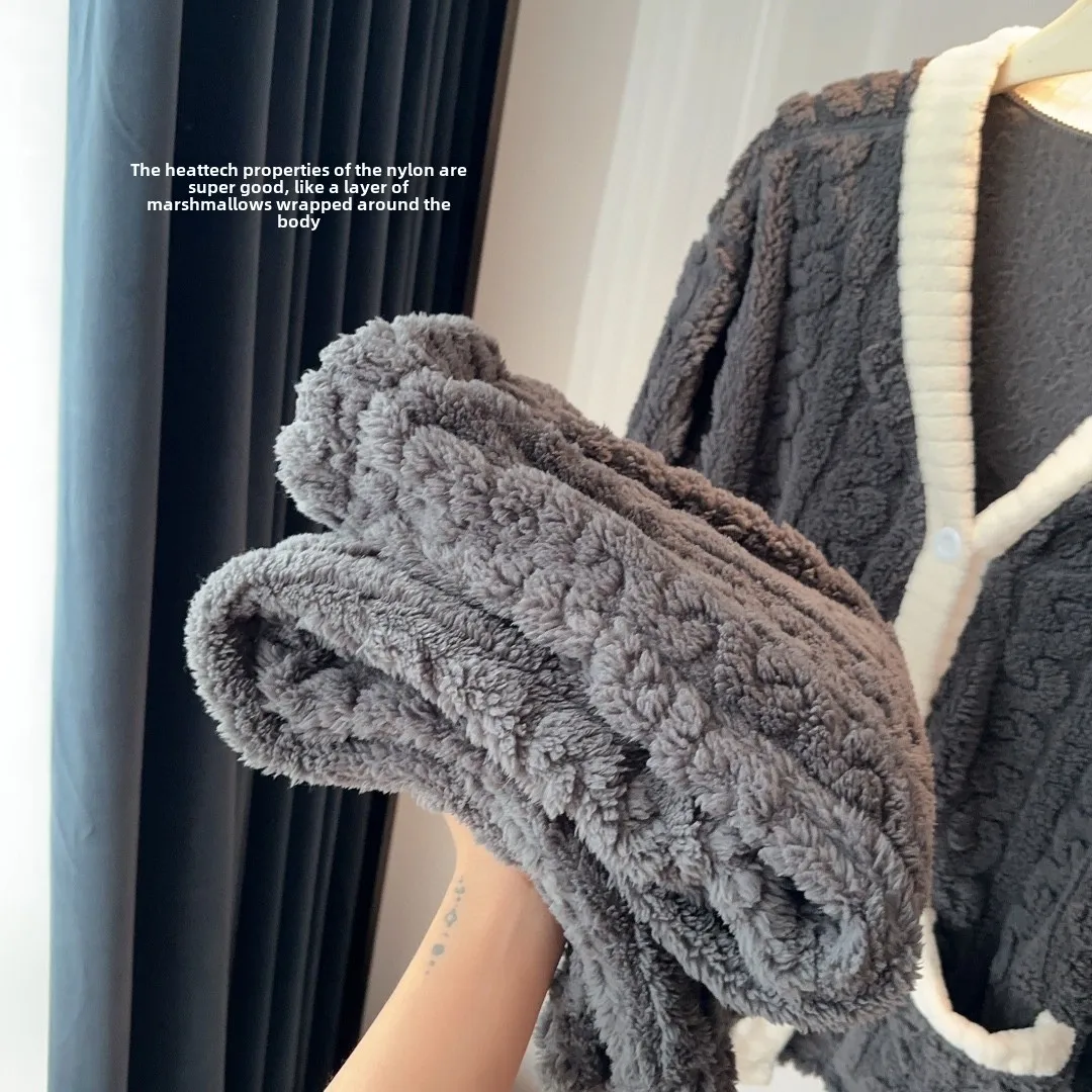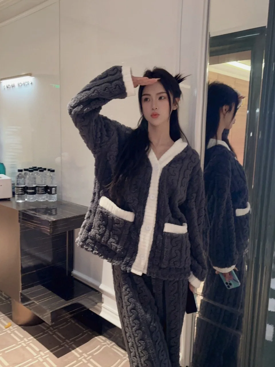 2pcs/Set Autumn and Winter Pajamas Women Thickened Padded Warm Students Coral Girls Clot Velvet Suit Homewear Cardigan Trousers
