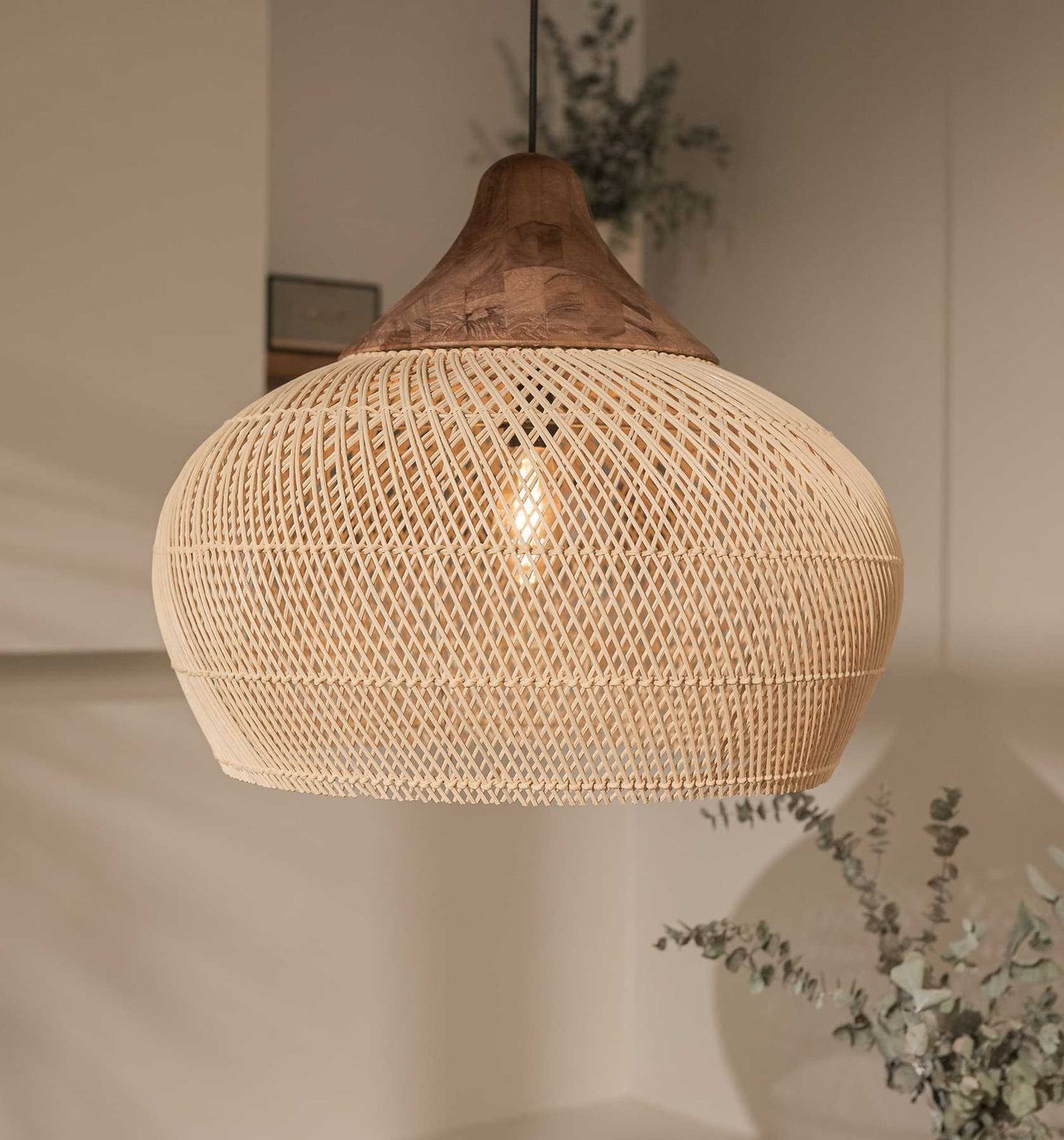 - Conception vintage avec un abat-jour en rotin tissé à la main pour une ambiance chaleureuse